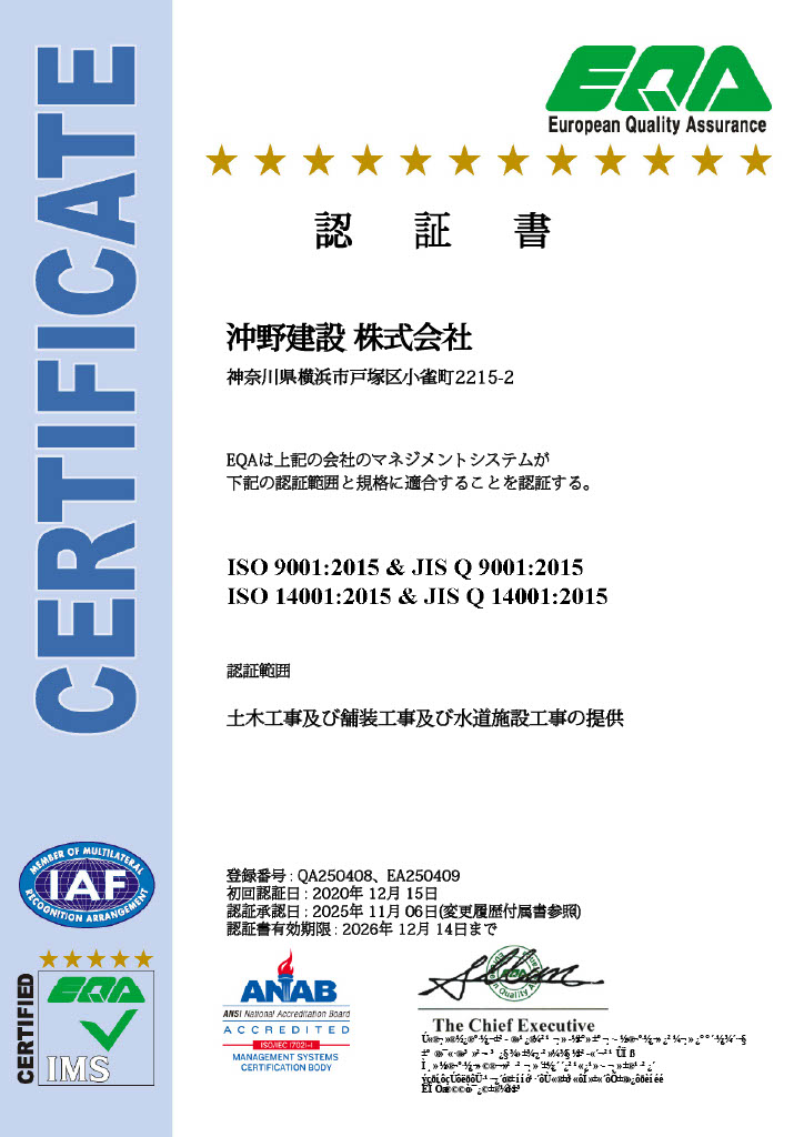 弊社では「ISO9001/ISO14001」の複合認証を取得しています。私たちは品質と環境問題を常に意識し、改善を図るとともに、持続可能な企業として促進することを目的に掲げて進んでまいります。